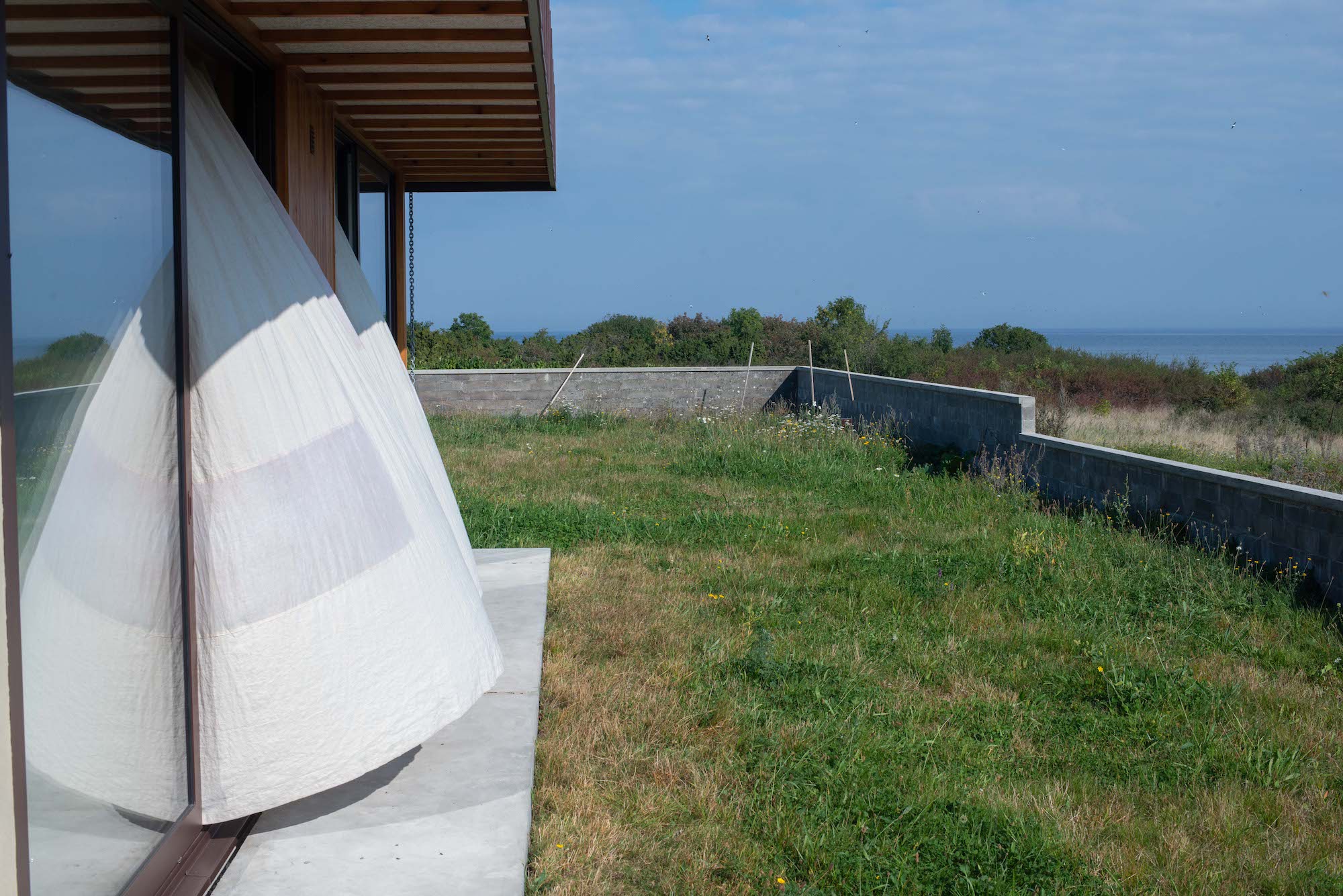 Another one of our projects is located in a different, but still very Gotlandic landscape—a flowery field by a rocky bay on the eastern coast of Gotland. Ateljé Djupvike was built to serve as a combined summer home and artist studio. It is an extremely thought-out house that was thoroughly designed in a years-long collaboration between the architect and client, along with several artisans and artists, all of whom were friends and colleagues of the client. Hand-woven curtains, fabric for a site-specific sofa, ornamented cabinets, cast-in sculptures and a big ceiling fresco are some examples of the art that is incorporated in the house. The property consists of five different structures including a root cellar. The air is filled with the soft smell of the sea, and when the sun rises over the horizon, it makes the house shine bright amidst the hilly landscape. The single-storey buildings have an obvious horizontality with their flat roofs and the entire ensemble is framed by low stone walls that draw lines in the landscape. The interior as well as exterior walls mirror the colours of the sunburnt field that lies between the house and the sea.