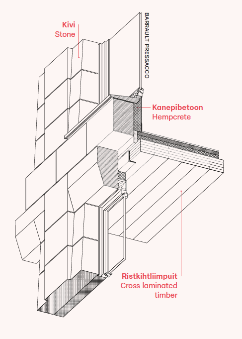 Materials: limestone, CLT, steel, concrete, hemperete