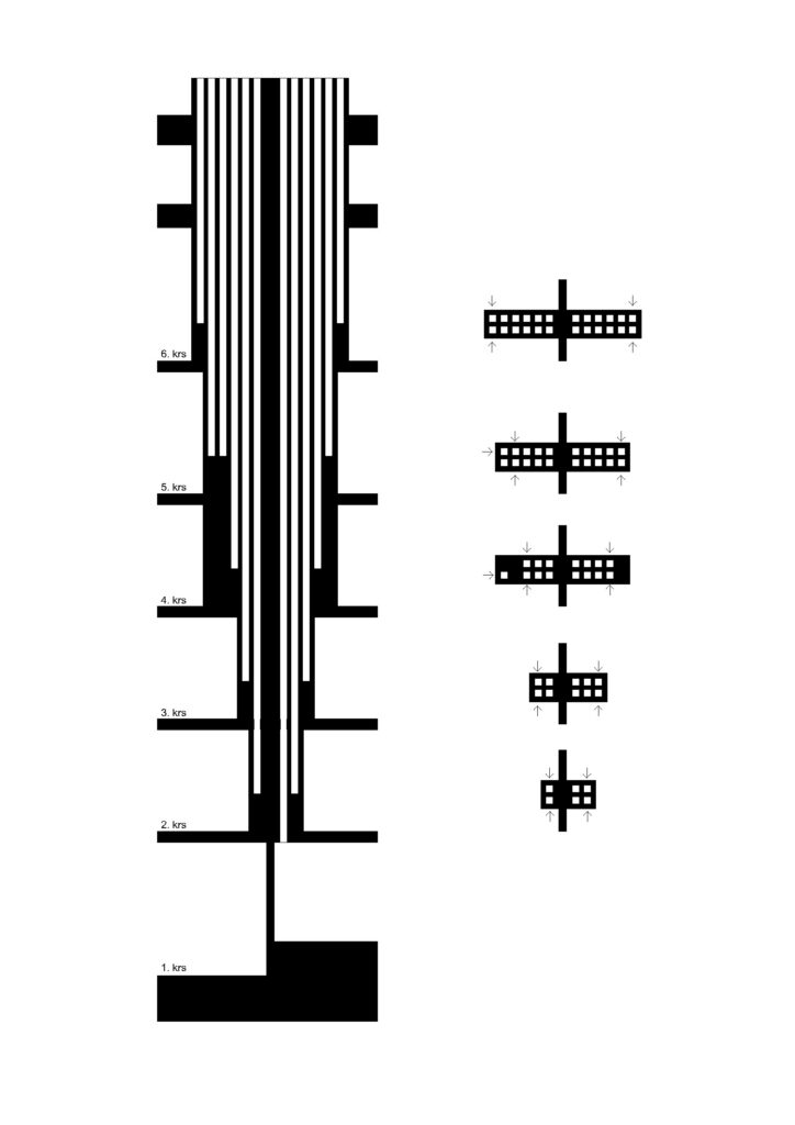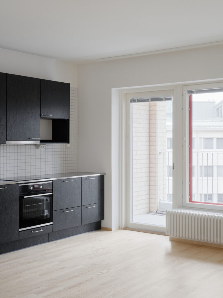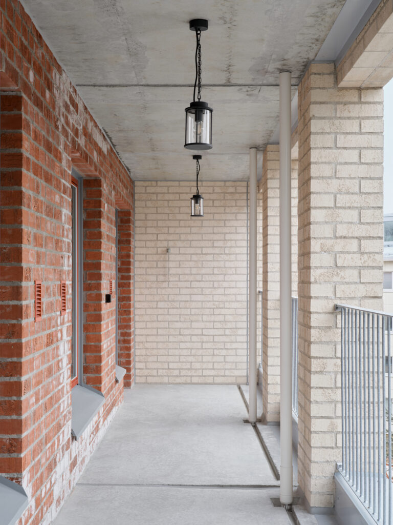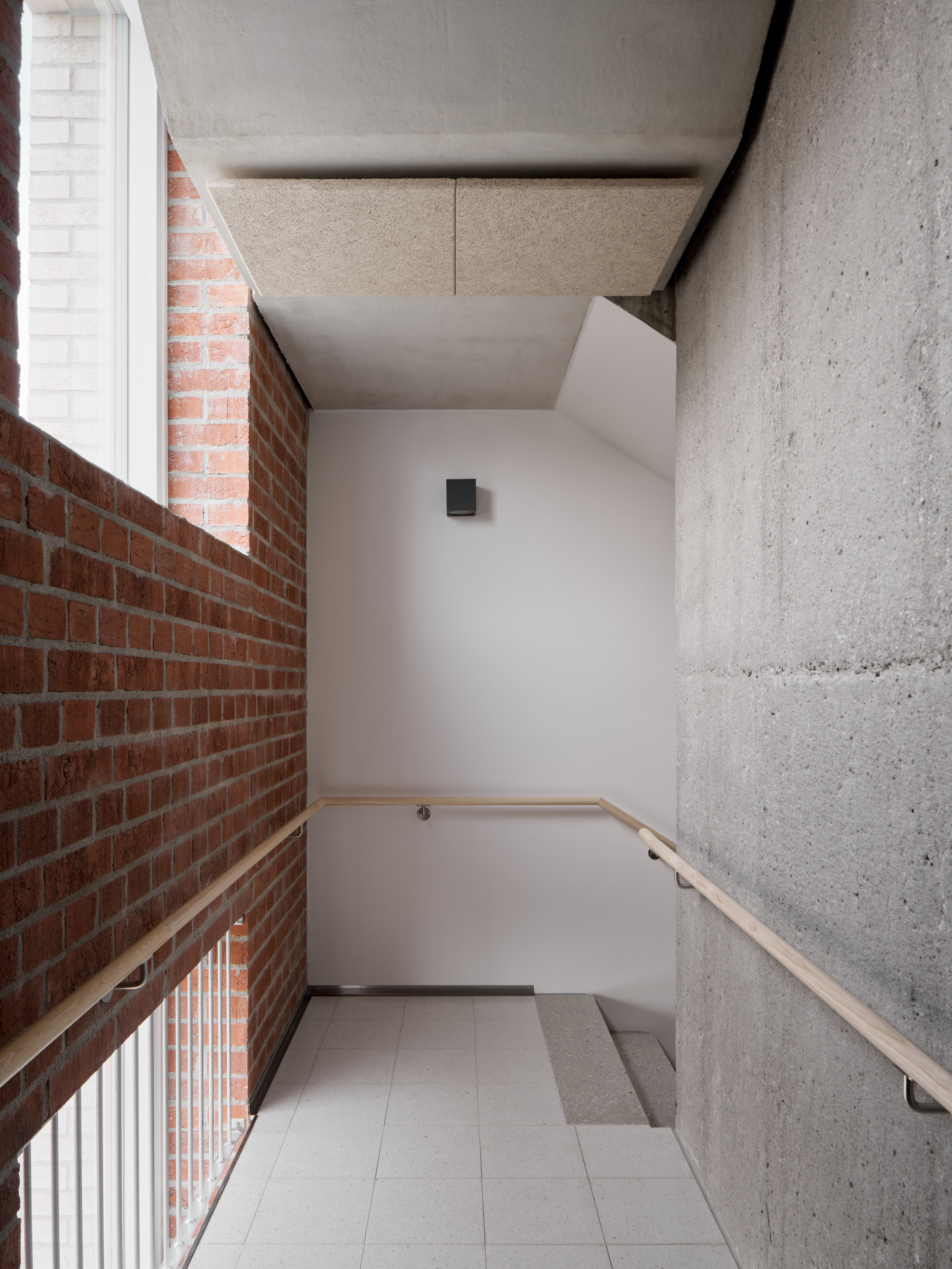 Helsingin Muurarimestari is a rare example of a contemporary housing project that utilises natural ventilation. With increasingly stringent regulations on building performance and concerns about the energy costs in heating and cooling, most new buildings utilise some form of heat recovery and exchange, i.e., a mechanically driven system where the heat from the exhaust air is captured to pre-heat intake air, reducing overall energy costs. Naturally ventilated systems, on the other hand, simply take air from exterior vents and channel them through the building. In the case of Helsingin Muurarimestari, exhaust air is channelled through a brick chimney that leads to the roof. Each unit has its own independent shaft in the chimney, which gets wider on the upper levels as more and more shafts are incorporated into the structure.