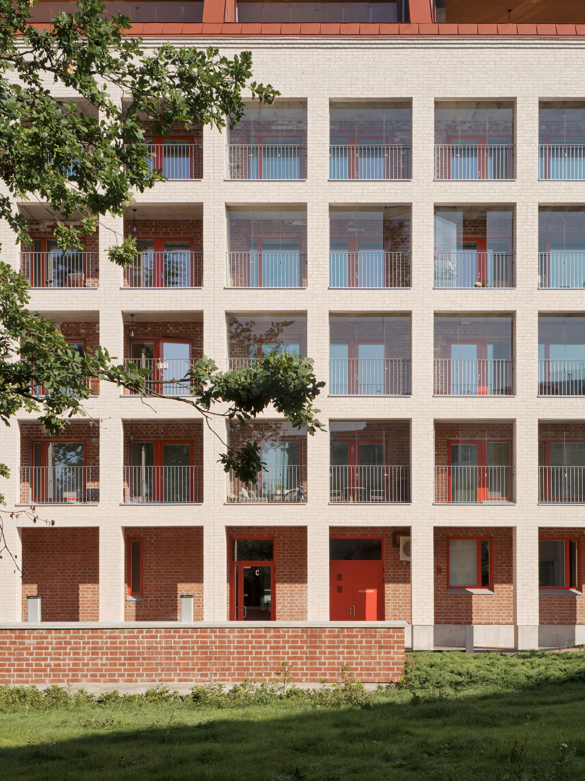 The project, however, is decidedly modern. It is generous to tradition, but not simply replicating those techniques for their own sake. It represents a clear and deliberate attempt at exploring the possibilities of constructing in monolithic brick today. Selective use of modern construction materials has played a supporting role in the performance of the building. The building’s concrete frame, for example, transfers the thermal mass far deeper into the building compared to wooden joists and beams used in historic brick construction. In place of the traditional lime-based mortar used in historic brick buildings, Helsingin Muurarimestari uses modern portland cement mortar, which offers far higher air-tightness performance. One particularly delightful innovation has been the integration of ventilation elements into the dividing walls of the balconies. While historic buildings have placed vents along the exterior facade, the current trend of large glazed balconies posed a particular challenge. Finnish fire safety regulations prevent the intake of air from glass-enclosed areas, and the architects have gotten around this by arranging the intake shafts in the dividing walls of the balconies—which the observant reader can see in the floor plans.