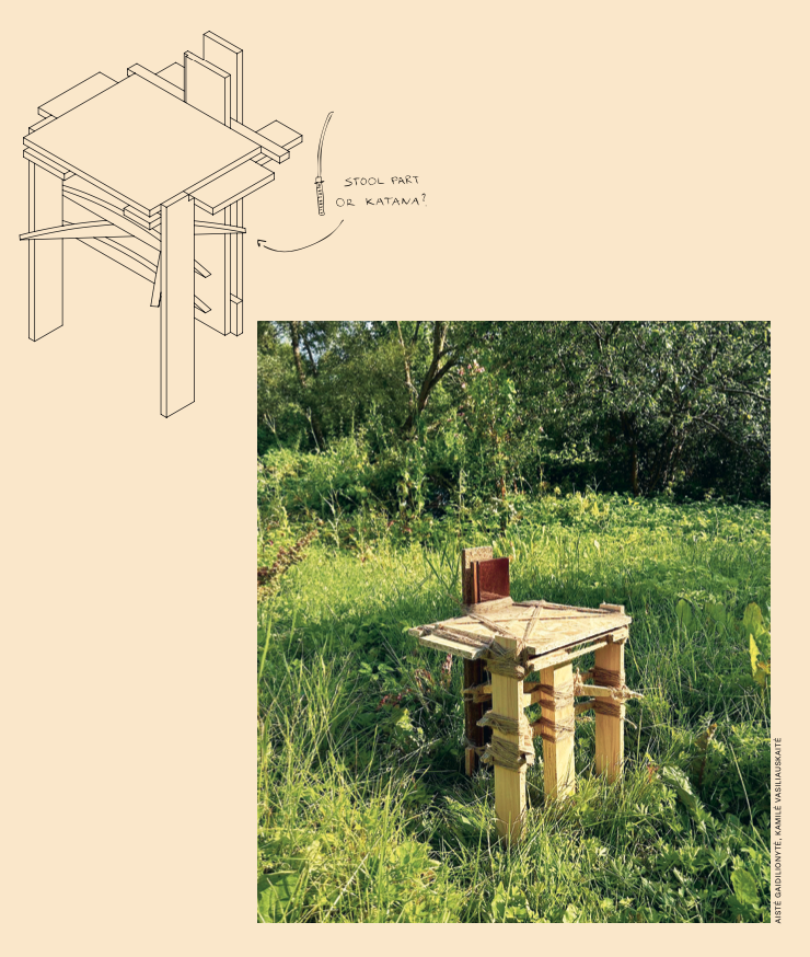 Having dived into the dense layers of glued wood and spent an extended time looking into the leftovers piled up at the residency, we took up a challenging experiment of organising, assembling, and disassembling. We had to find a way to work with the sketchy materials, raising the question of how to reuse them. The process led to constructing ‘sketchy objects’—vibrant mosaics and stools made of the sketchy scraps and bound together with natural jute rope. After all, even the sketchy particleboards are not completely hopeless—they can still be an ecological material if they have been produced fully from leftover wood and bonded with natural resins that do not emit toxic fumes.