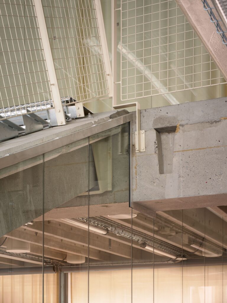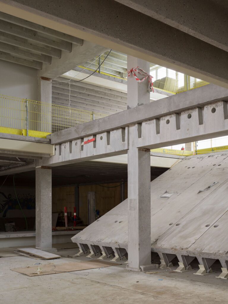 The concrete columns, ceilings and floors are exposed in their robustness, and a spatial gesture is made with slanted concrete TT floor panels supporting the staircase, making the new foyer feel more spacious and allowing natural light to pass through the building. The idea, which appears simple at first, required extremely precise execution. For example, during the cutting and lowering of the floor plate, it was necessary to maintain the internal tension of its reinforcement so that the plate would not collapse under its own weight. The construction process involved 3D scanning of structural elements, custom furniture design, meticulous planning for on-site material storage, and making sure that the roof stays in place during the large-scale works.