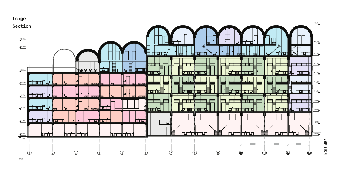 In 2024, Molumba Architects received annual architecture awards from both the Estonian Association of Architects and the Cultural Endowment of Estonia for converting the former factory at Bekker Port, Ankru Street 8 in Tallinn, into an apartment building. The requirement to preserve the existing concrete frame was written into the brief by the developer Hausers for practical considerations—this enabled to avoid pouring new foundations and structures, start the construction works earlier, obtain the necessary permits more easily (since it was categorised as an extension rather than a new development), and get a market advantage from the resulting rough industrial look.