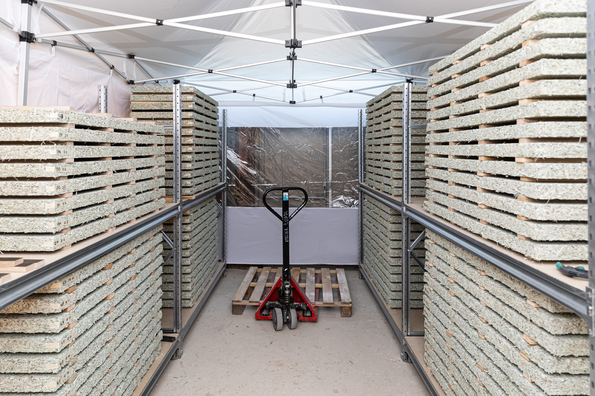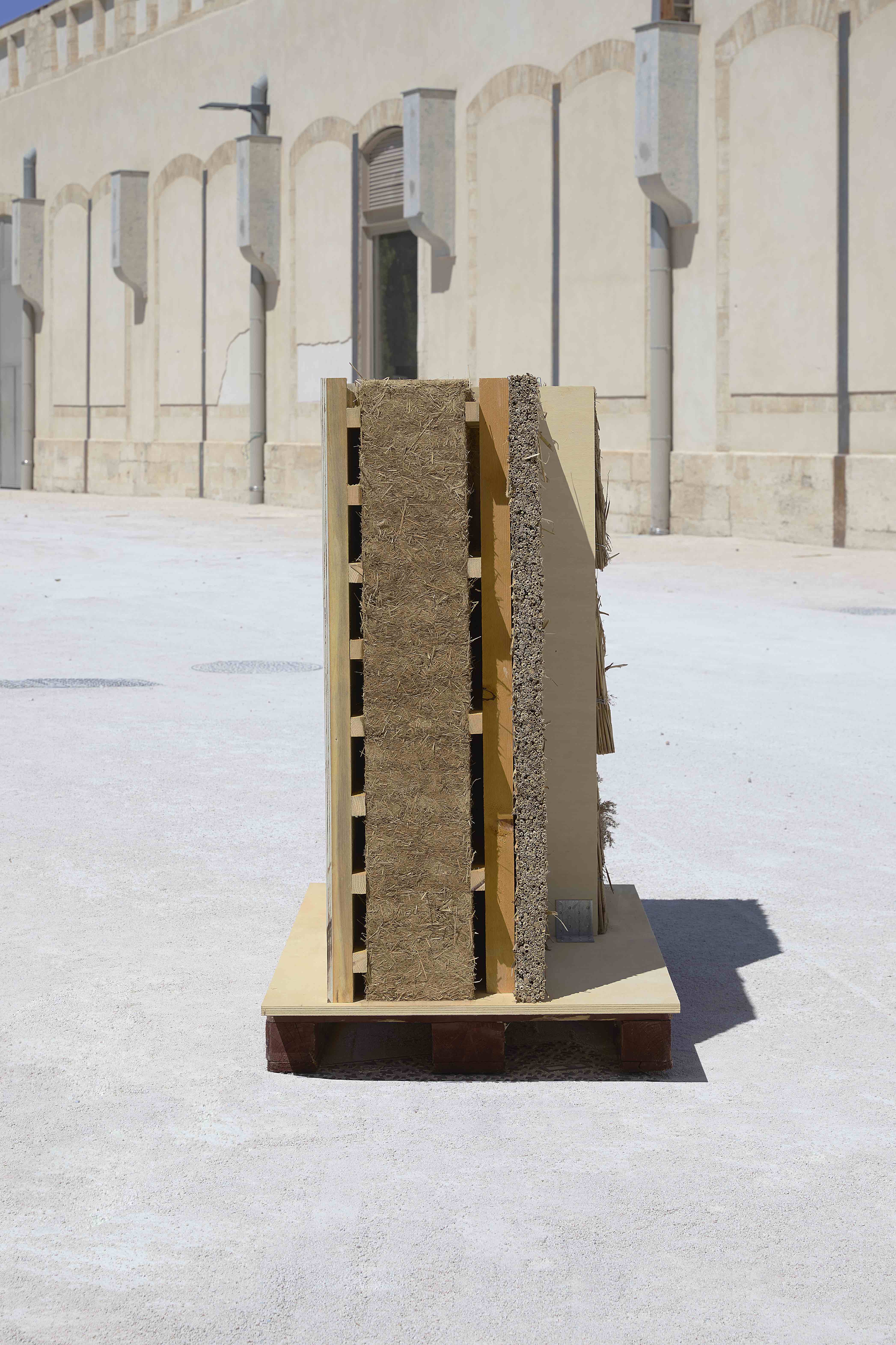 Sunflowers are grown in the Arles’ region as an industrial monoculture. Atelier LUMA developed construction panels made of sunflower stems—otherwise an byproduct—by shredding them and mixing them with lime-based binding mediums and natural pigments.