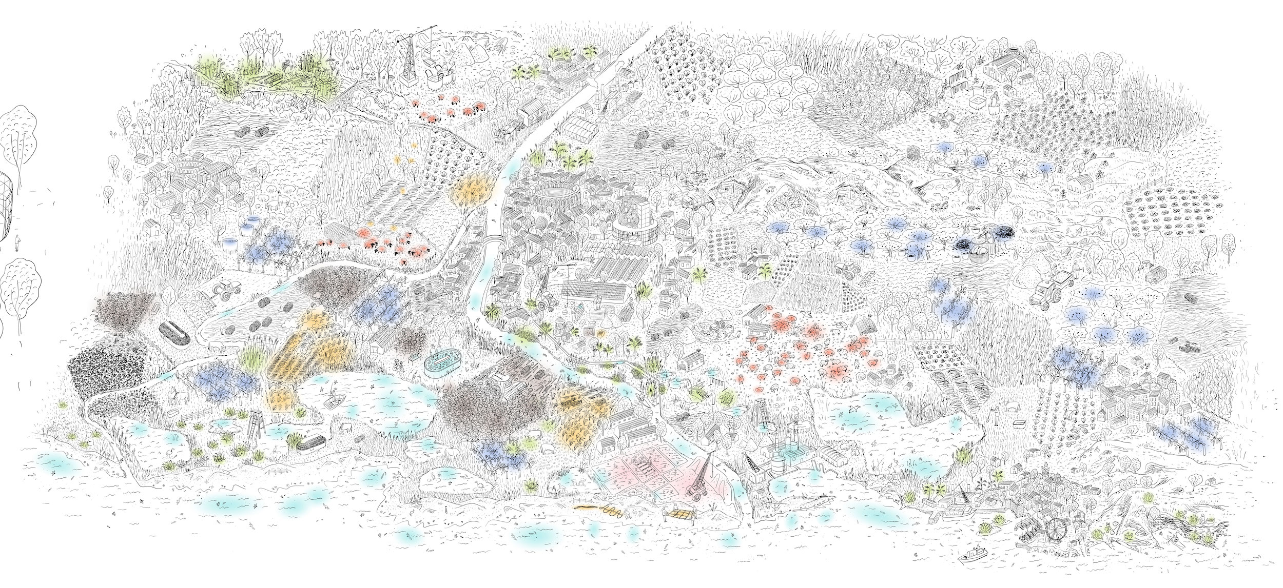 Bioregionalism is a concept that emerged in the 1970s in post-hippie California, driven by radical ecological movements encouraging local autonomy in the face of industrial society. In their 1977 article ‘Reinhabiting California’, Peter Berg and Raymond Dasmann, founding figures of the movement, call for the ‘reinhabitation’ of territories.1 Their essay not only advocates a return to nature, but also criticises modern fragmentation, which separates spaces of production and use, political decisions, and ecological realities. The bioregion is described as a territory delimited not by administrative boundaries, but by relatively homogeneous ecological characteristics (watersheds, geology, geomorphology, climate, living ecosystems, etc.). But it would be simplistic to believe that these divisions are purely ecological. According to landscape architect Robert Thayer, bioregion is the most logical place and scale for the sustainable and invigorating establishment and rooting of a community.2 A bioregion, therefore, is also cultural and social. The communities that live there develop their identity, practices, and narratives in direct connection with the resources and constraints of the territory.
