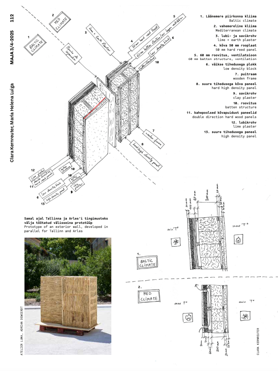 Centred on two abundant local resources, reed (Phragmites australis) and clay, the project investigated their potential as contemporary construction materials, culminating in the design of a speculative external wall section. The research unfolded in parallel across two distinct climate zones, the cold, humid continental climate of Tallinn and the Mediterranean climate of Arles, examining the same resources through localised perspectives, including ecological functions, harvesting logistics, and seasonality, as well as vernacular and contemporary building practices.