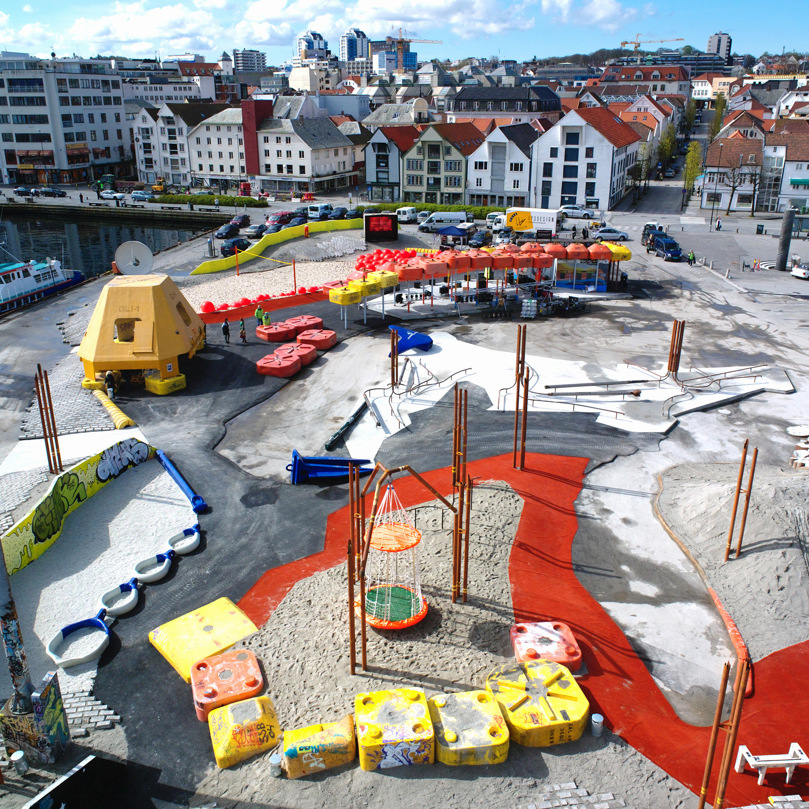 Olemuslikku maastikku võib saavutada ka üksnes tehislikke elemente kasutades. Büroo Helen & Hardi disainitud Geopark Norra naftapealinnas Stavangeris loob naftatööstuse poolt kasutuseta jäetud objektidest mänglevaid atraktsioone. Pargi vorm on reproduktsioon Atlandi ookeanis asuvast Trolli naftareservuaarist, mis paljastab selle veealused geoloogilised kihid. See loodi digitaalsete vahenditega, kaasates kohalikke eksperte ja lapsi, kelle abiga valiti välja asukoht rulapargile ja tänavakunsti seinale. Ajutisena mõeldud mängupargist on saanud püsiv ajaveetmiskoht, mis paneb ruumi kasutajat mõtlema loodust hävitavale tööstusele. Geopark kui geoloogilist pärandit tutvustav park saab siinses kontekstis uue tähenduse.